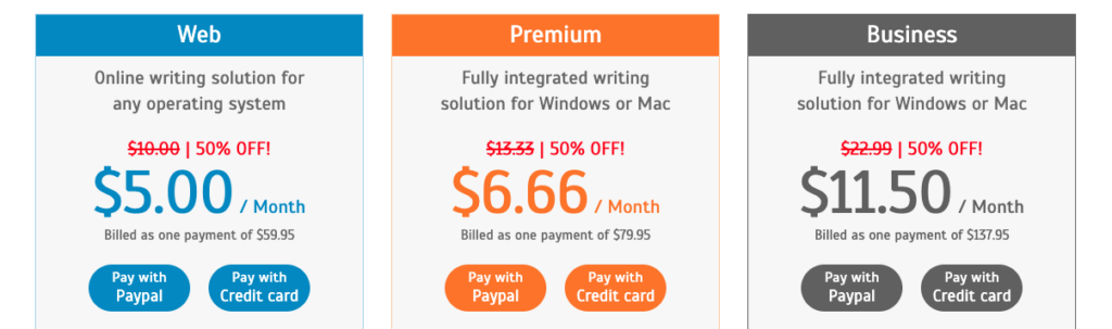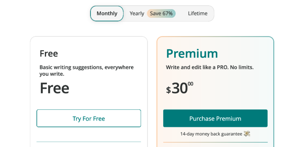 It offers Individual accounts and team accounts. Its Premium subscription starts from $30 per month, the same as Grammarly Premium. And if you purchase it yearly, it’ll cost you only $10 per month. Ultimately, the lifetime subscription will cost you $399.