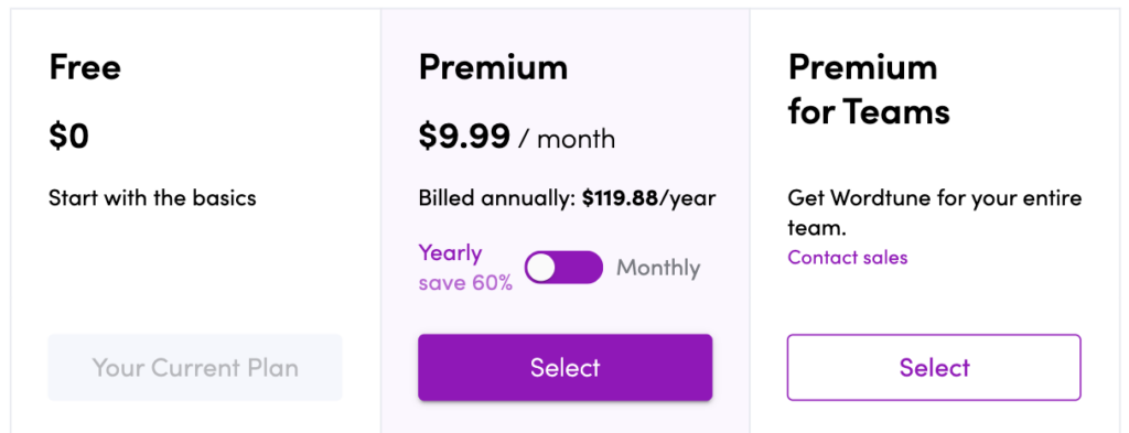 You can use this writing assistant for free or start a premium subscription to it. A WordTune Premium subscription starts at $9.99 monthly, which is cheaper than Grammarly Premium.